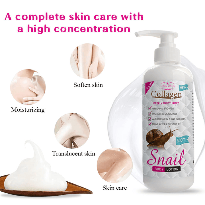 - لوشن الجسم بالكولاجين والحلزون - ترطيب وعلاج فائقين: جربي قوة لوشن الجسم بالحلزون، وهو منتج للعناية بالبشرة يعمل على ترطيب البشرة الجافة والتالفة بعمق وإصلاحها. يترك بشرتك ناعمة ومتجددة.