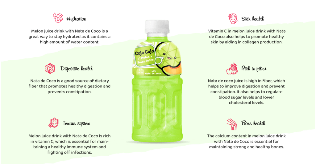 عصير ناتا دي كوكو هو مشروب منعش يحتوي على ناتا دي كوكو، وهي مادة هلامية شفافة لزجة مصنوعة من ماء جوز الهند المخمر. ناتا دي كوكو غني بالألياف الغذائية والفيتامينات والمعادن، وله عدد من الفوائد الصحية المحتملة ومع ذلك، كما هو الحال مع أي طعام أو شراب، قد تكون هناك أيضًا بعض الآثار الجانبية المحتملة التي يجب مراعاتها.