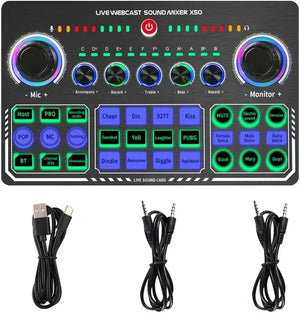 - [ما ستحصل عليه] 1* بطاقة صوت X50، 1* ميكروفون مكثف BM800، 1* كابل ميكروفون XLR إلى 3.5 مم، 1* ذراع ميكروفون، 1* حامل صدمات، 1* فلتر ميكروفون، 1* غطاء رغوي مضاد للرياح، 1* كابل شحن USB إلى النوع C، 2* كابل صوت TRRS 3.5 مم، 1* دليل المستخدم، 1* تعليمات.