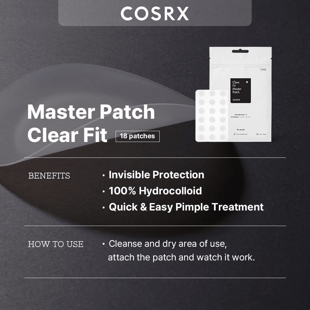 رقعة COSRX Clear Fit Master Patch هي رقعة رقيقة للغاية لعلاج حب الشباب تأتي في شكل متدرج مع لمسة نهائية غير لامعة، وهي بالكاد ملحوظة عند وضعها على الجلد.