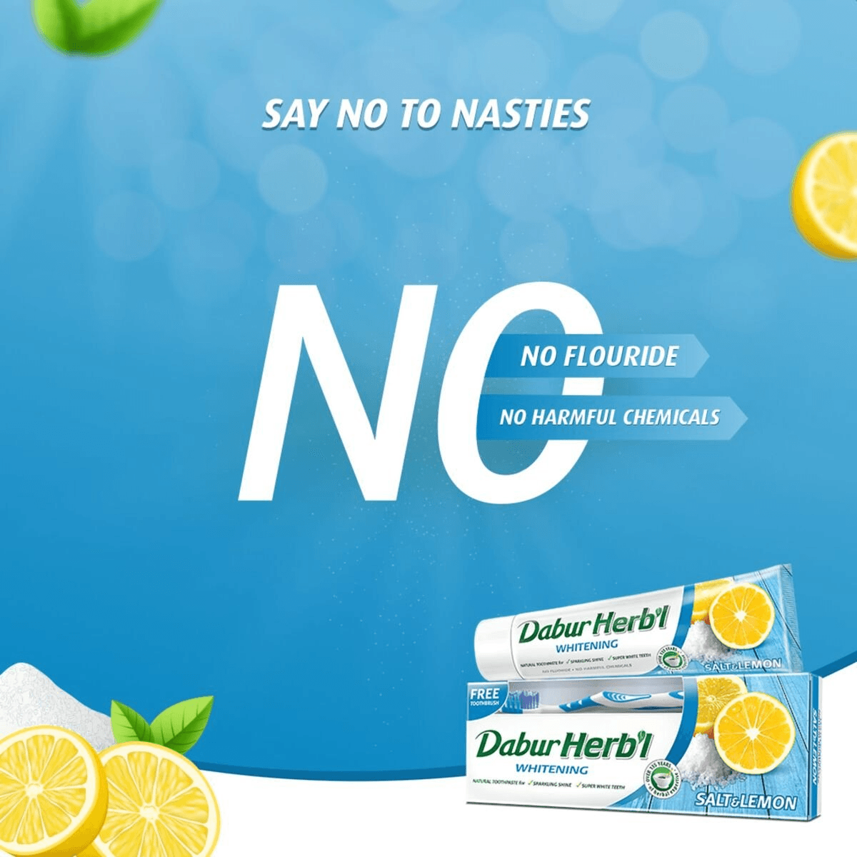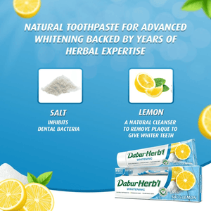 يأتي معجون الأسنان الطبيعي Dabur Herbal Whitening بالملح والليمون مما يساعدك على التخلص من الأسنان الملطخة. يقلل الملح الطبيعي في معجون الأسنان من المحتوى الحمضي في الفم ويوازن مستوى الأس الهيدروجيني الطبيعي، وبالتالي يمنع تسوس الأسنان. يعمل مستخلص الليمون في معجون الأسنان كعامل تبييض ويجعل أسنانك أكثر بياضًا. كما أنه يساعد في صحة الفم بشكل عام ويمنح الفم نضارة. إنه خالٍ من الفلورايد والمواد الكيميائية الضارة. يأتي معجون الأسنان الطبيعي Dabur Herbal Whitening مع فرشاة أسنان كمكمل.