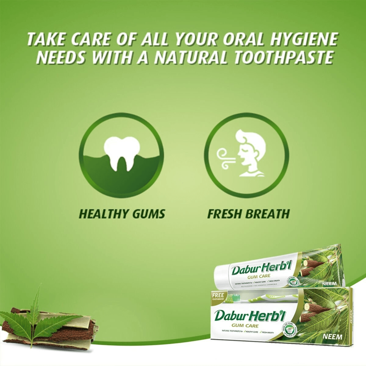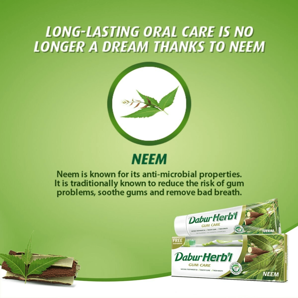 - معجون أسنان طبيعي: مزيج فريد من مستخلص النيم الموثوق به مع الكالسيوم الطبيعي الذي يساعد على ضمان صحة اللثة وقوتها. يساعد النيم الطبيعي في معجون الأسنان على تقليل ترسب البلاك ويعزز الاستجابة المناعية لصحة الفم.