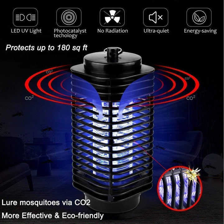 - مكافحة فعالة للبعوض، ضوء LED فوق بنفسجي متطور 365 نانومتر يجذب الحشرات إلى الجهاز، ثم يلتقطها ويقتلها من خلال شبكة معدنية للشحن عالية الجهد.