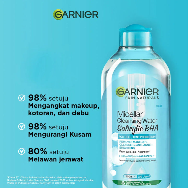 ماء غارنييه المنظف الأول من غارنييه ساليسيليك ساليسيليك BHA، يزيل المكياج + يقلل من حب الشباب + يضيء البشرة. بدون شطف! تركيبة ناعمة غير مسببة للحساسية بدون عطر، مناسبة للبشرة الباهتة والدهنية والمعرضة لحب الشباب.