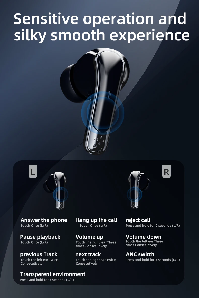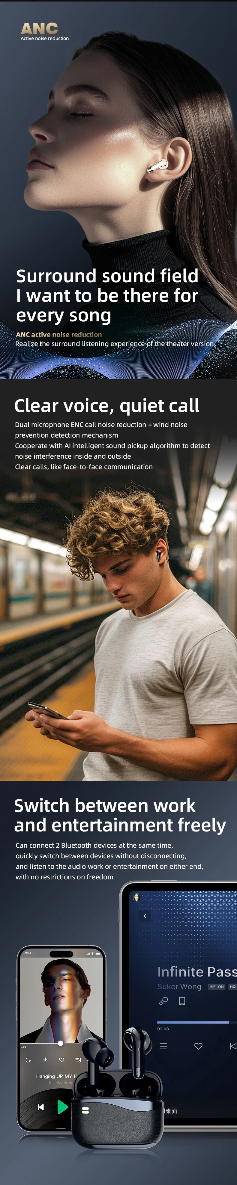ANC + Dual Mics – Active Noise Cancellation paired with dual microphones for crystal-clear voice pickup and effective background noise reduction.