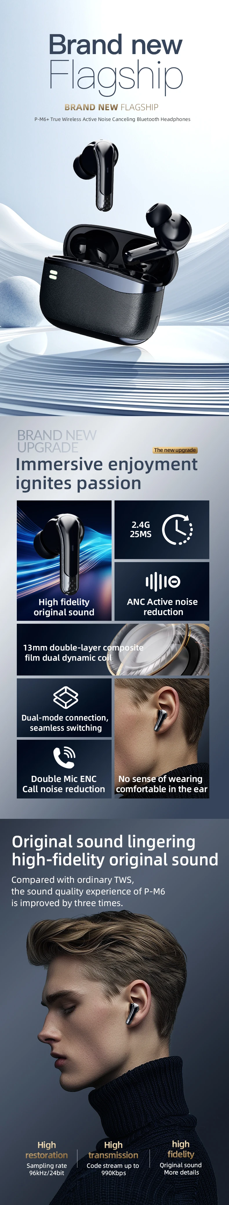 Experience high-performance audio with the HIE-Q M6 PRO, the ideal earbuds for users who demand quality, speed, and clarity. Featuring 2.4G wireless support, these earbuds deliver low-latency performance that's perfect for gaming and high-speed streaming. Advanced Active Noise Cancellation (ANC) with dual microphones blocks out external noise, while ENC ensures your voice stays clear even in noisy environments.