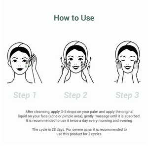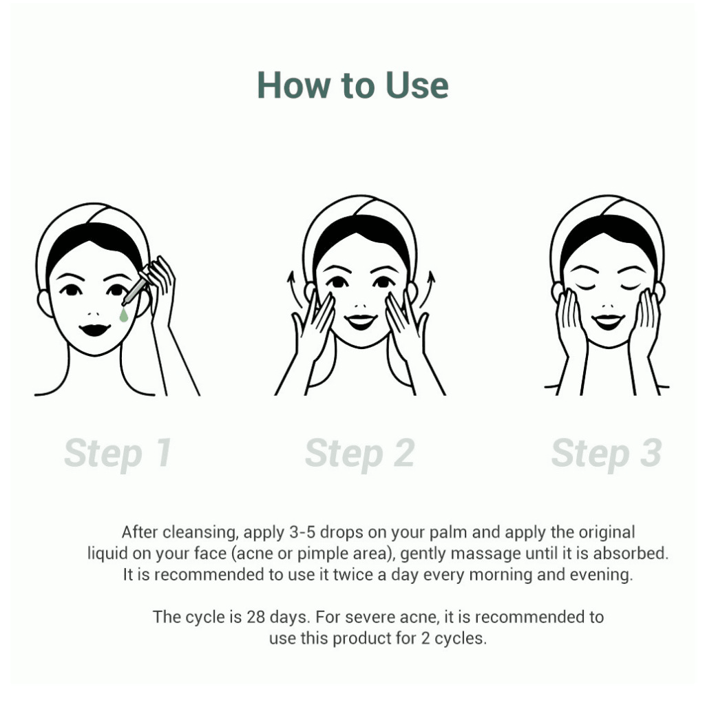 1. بعد التنظيف، ضعي 2-3 قطرات من الكمية المناسبة من السائل على الوجه أو العين، ودلكي بلطف حتى يتم امتصاصه.