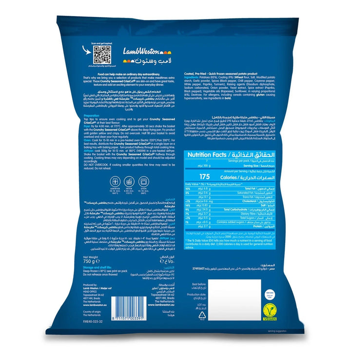 اختبر التوازن المثالي بين النكهة والقرمشة مع بطاطس كرسكوت كرسكوت المتبل من لامب ويستون. مصنوعة من بطاطس عالية الجودة، هذه البطاطس المقلية ذات الشكل الفريد من نوعها مقلية مسبقًا وسريعة التجميد للحفاظ على نضارتها ونكهتها وقوامها المقرمش.