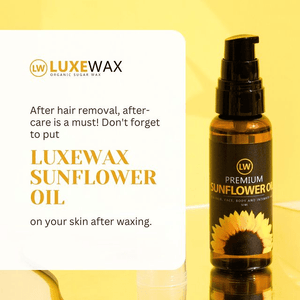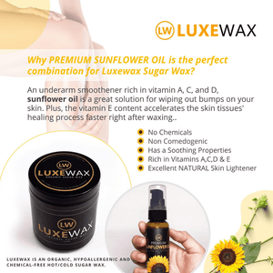 زيت عباد الشمس العضوي من Luxewax – زيت العناية المثالي لبشرتك بعد استخدام شمع السكر. استمتعي بالتغذية والترطيب المثاليين مع هذا الزيت العضوي المصمم خصيصًا لتهدئة بشرتك وتدليلها.