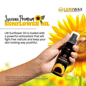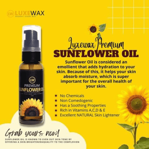 مفتح طبيعي ممتاز للبشرة: احصلي على بشرة متألقة وموحدة اللون مع زيت عباد الشمس Luxewax. يعمل هذا المنتج الاستثنائي على تفتيح بشرتك بشكل طبيعي، مما يقلل من ظهور البقع والتصبغات.