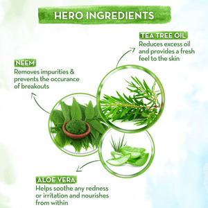 - مضاد للبكتيريا: خصائص مضادة للبكتيريا ومطهرة طبيعية من زيت النيم وشجرة الشاي تمنع ظهور حب الشباب والبثور بشكل منتظم.