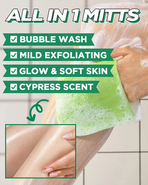- وداعًا للصابون والمقشرات: قفازات التقشير العميق هذه مصنوعة من مكونات طبيعية، وتُنتج رغوة ناعمة وكثيفة، مما يُغني عن الصابون أو غسول الجسم أو المقشرات. تُزيل هذه المقشرات، المُخصصة للاستحمام، خلايا الجلد الميتة والشوائب من المسام، مما يجعل البشرة أكثر نعومةً ونضارةً.