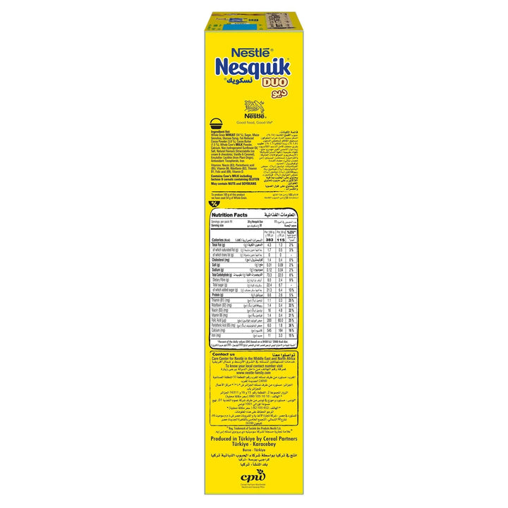 - امنح عائلتك بداية رائعة مع NESQUIK DUO الذي يجمع بين المذاق الرائع لكرات حبوب الكاكاو وكرات الشوكولاتة البيضاء بنكهة NESQUIK ويوفر لأطفالك العناصر الغذائية الأساسية التي يحتاجونها ليوم نشط.