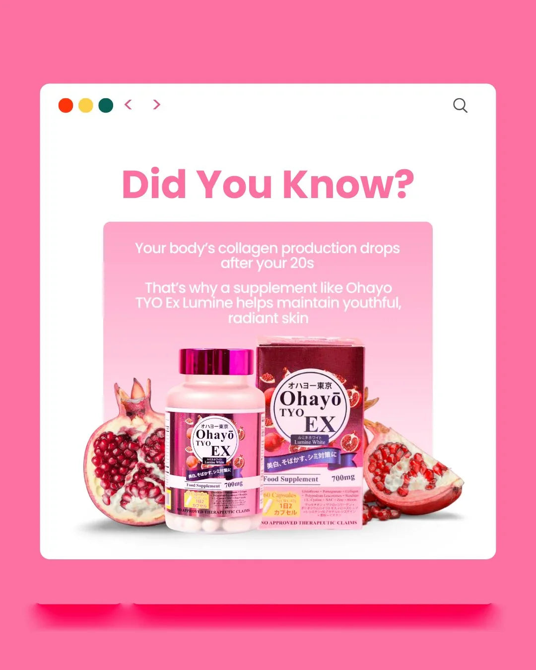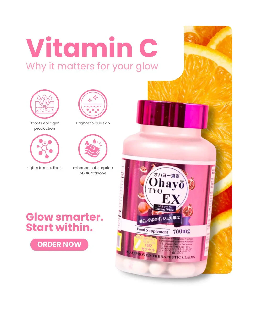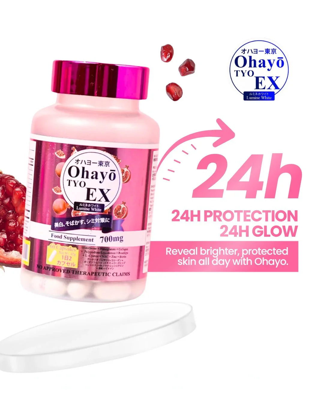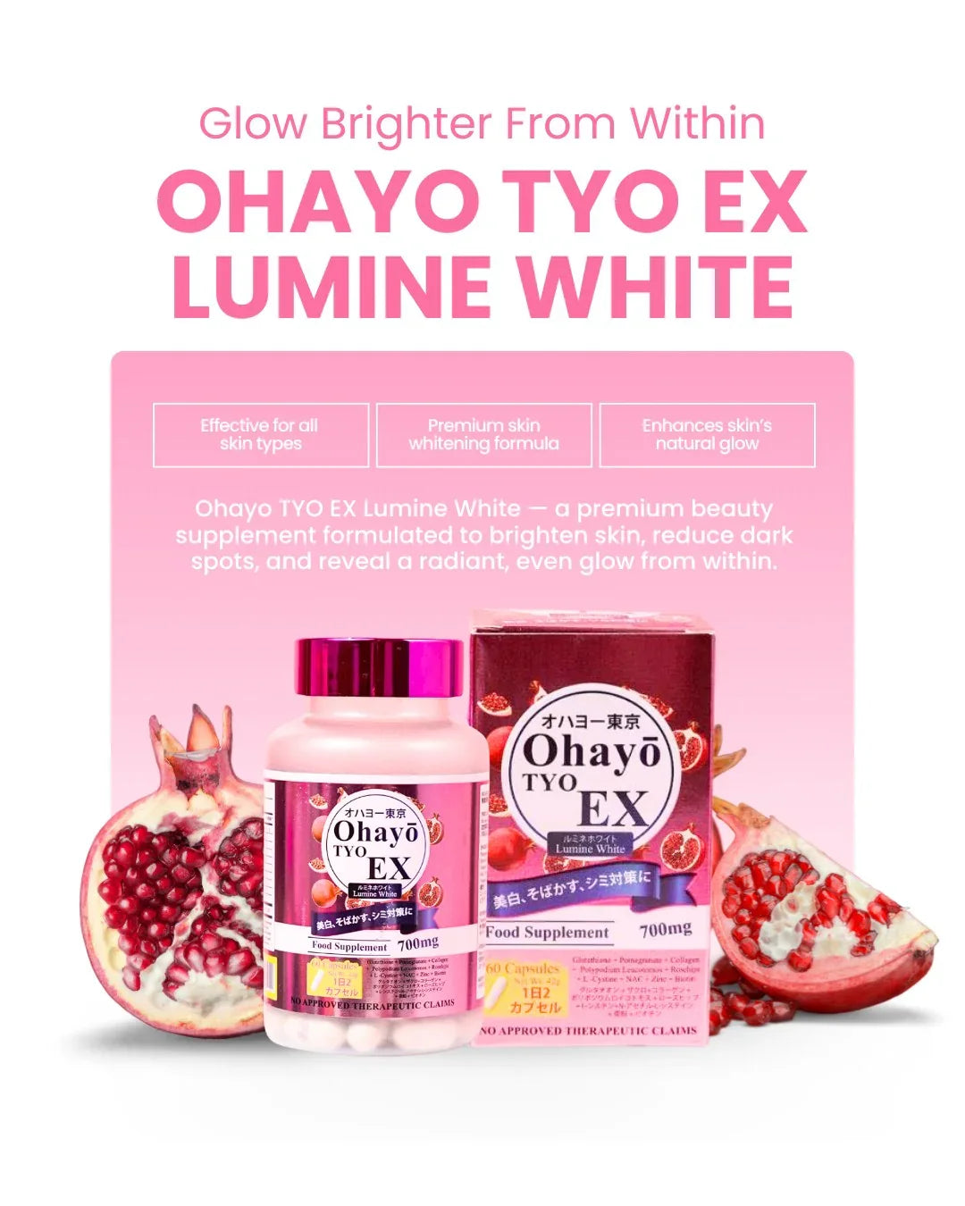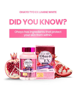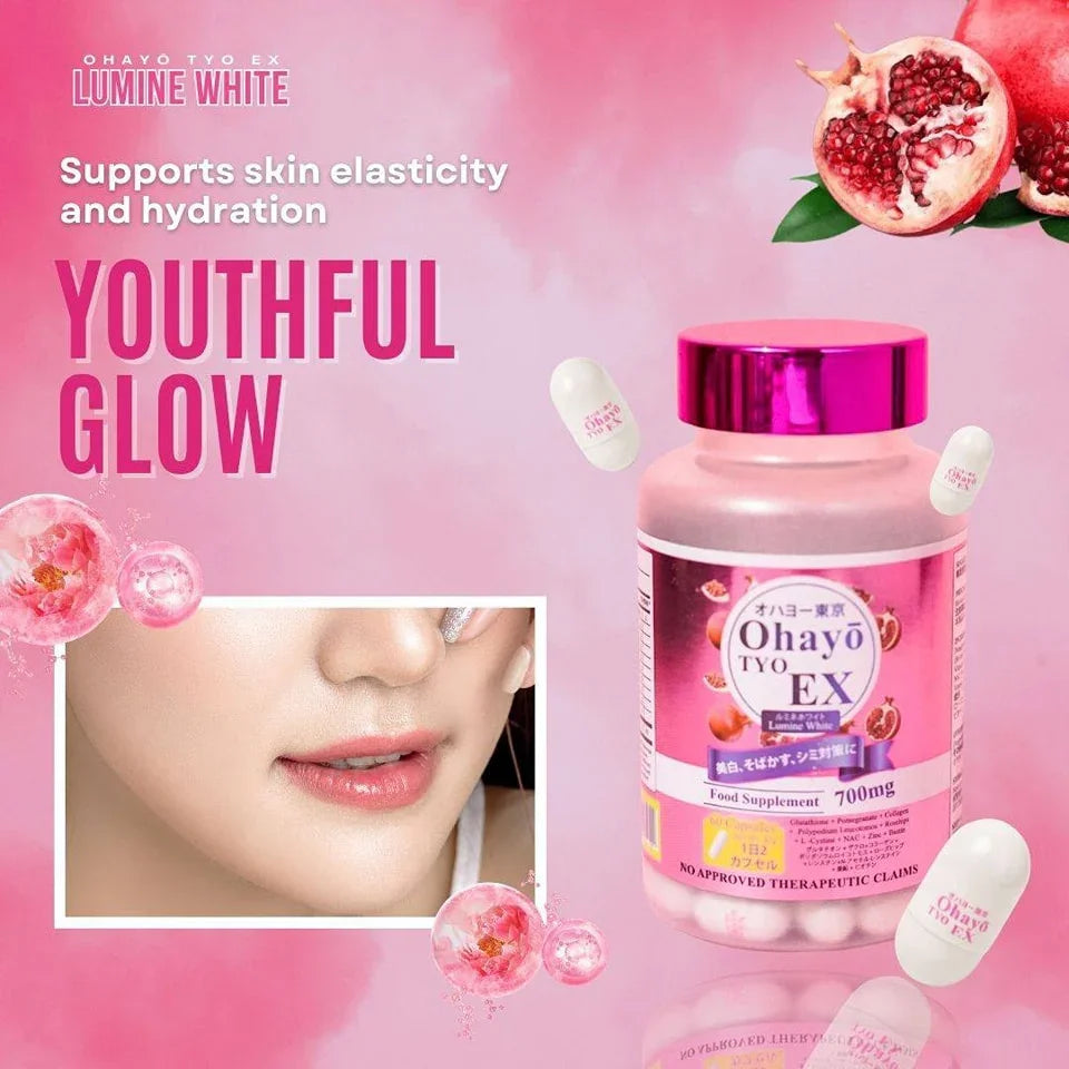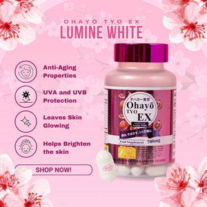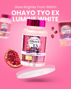 احصل على بشرة مشرقة ومضيئة وخالية من العيوب مع أوهايو تايو إكس لومين وايت، وهو مكمل غذائي ياباني الصنع ممتاز مصمم لتبييض البشرة وإشراقها وصحة البشرة بشكل عام. مدعوم بشهادة تسجيل المنتج، يقدم هذا المزيج المتطور نتائج فعالة مع كل كبسولة.