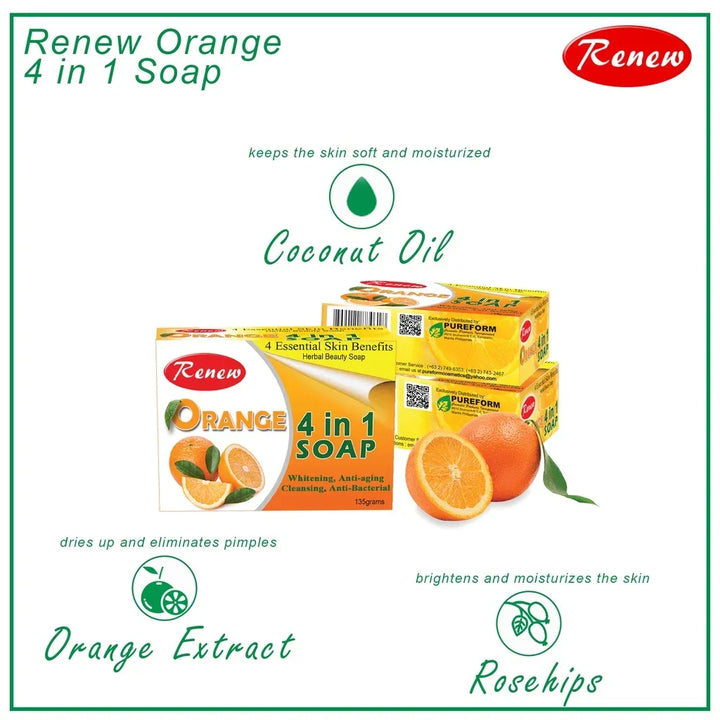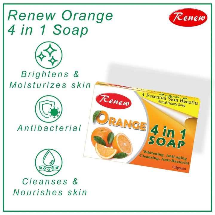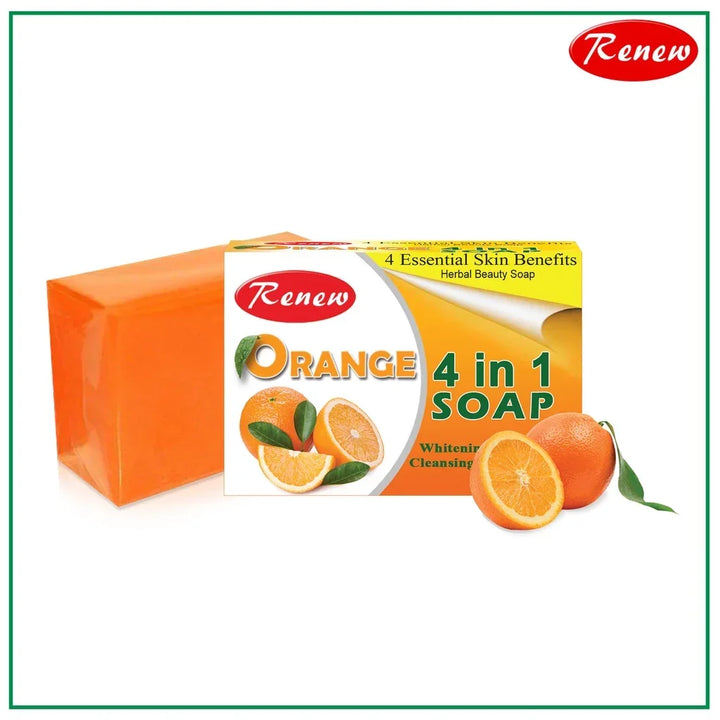 Renew Orange 4 in 1 Soap is specially formulated to give four essential benefits to the skin- Whitening, Anti-aging, Cleansing, Antibacterial.