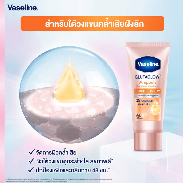 فازلين دراي سيروم جلوتا جلو مزيل العرق برايت رينيو تركيبة خفيفة الوزن، تجف بسرعة مضاعفة، مع مزيج فريد من الجلوتاثيون والكولاجين وفيتامين سي المركز ثبت سريريًا أنه يعمل على إصلاح وتفتيح بشرة الإبط بعمق يمتص بعمق ويستعيد سطح الجلد التالف للحصول على إبط صحي ومشرق حماية من العرق والرائحة لمدة 48 ساعة