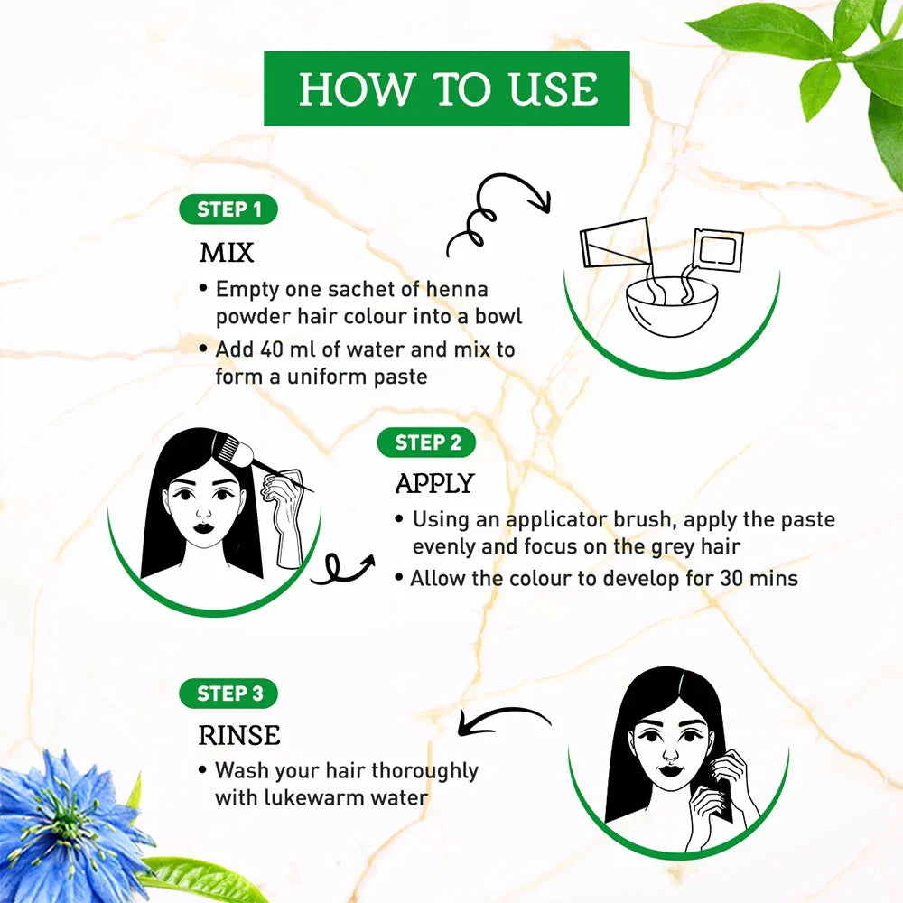 - تغطية رمادية بنسبة 100%، مرطب حناء نقي، خالٍ من الأمونيا