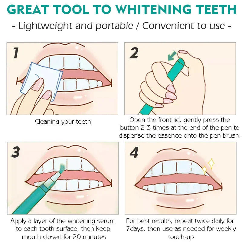 آمن للاستخدام اليومي - مع دقيقة واحدة فقط في اليوم، يمكنك الحصول على نتائج واضحة في أقل من أسبوع. يدوم كل قلم لأكثر من 20 تطبيقًا، مما يؤدي إلى تبييض الأسنان حتى 4-8 درجات أفتح.