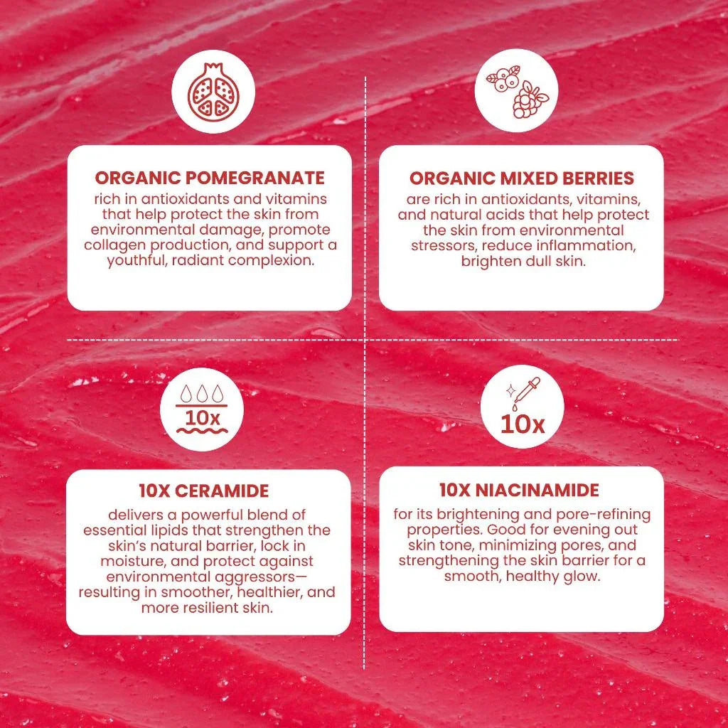 Enriched with Organic Pomegranate and Mixed Berries, rich in essential minerals, this scrub helps reduce dullness and revive tired-looking skin. The powerful combination of 10x Ceramide Multi Complex and 10x Niacinamide works to lock in moisture, strengthen the skin barrier, and enhance skin brightness, revealing a supple and radiant complexion.