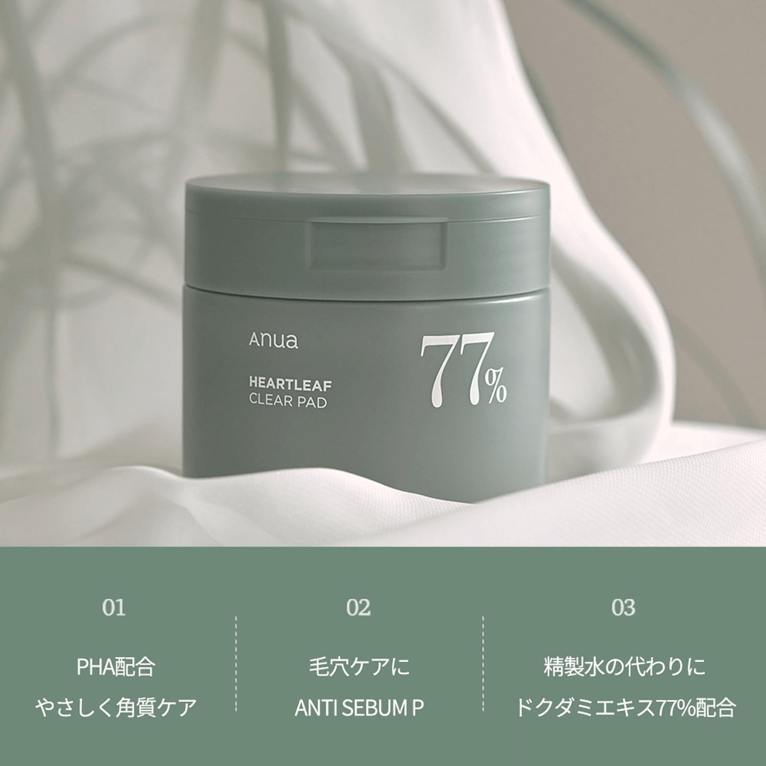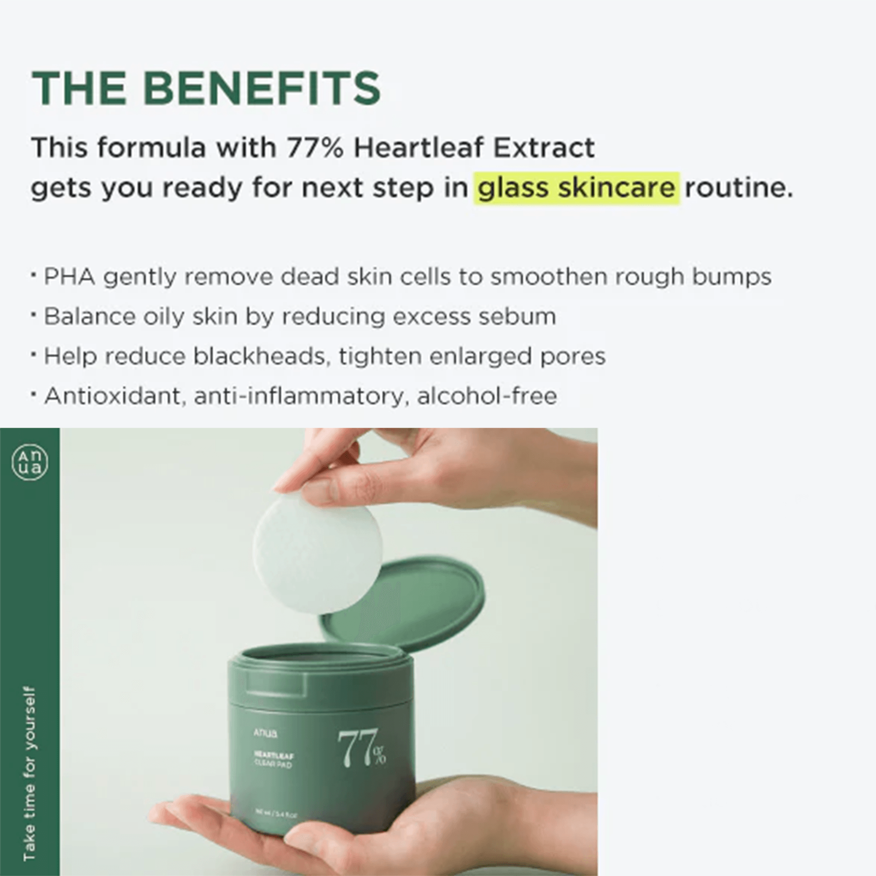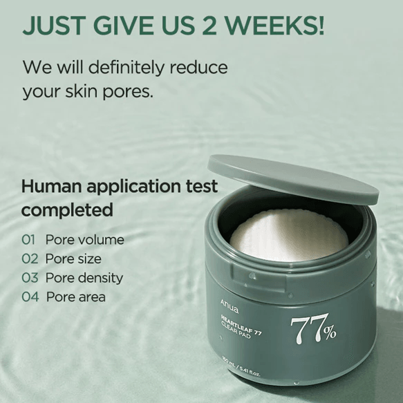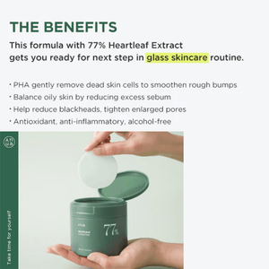 - A moisturizing cleansing pad soaked in Heartleaf 77% Soothing Toner that helps remove skin impurities and tighten pores.