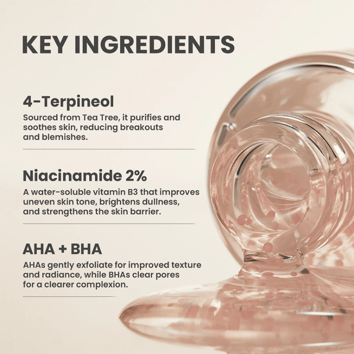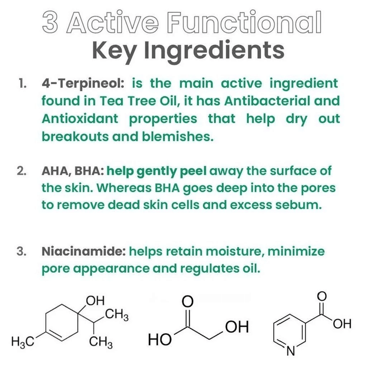 - Tea Tree Extract - Helps soothe skin and reduce irritation, dries out blemishes and breakouts