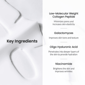 Water, Collagen Extract, Galactomyces Ferment Filtrate, Glycerine, Acrylates Copolymer, Niacinamide, Ceratonia Siliqua (Carob) Gum, Chondrus Crispus Extract, Betaine, Algin, Dipropylene Glycol, Agar, Hydroxyacetophenone, 1,2-Hexanediol, Potassium Chloride, Polyglyceryl-10 Laurate, Caprylyl Glycol, Sucrose, Butylene Glycol, Allantoin, Ethylhexylglycerin, Hydrolyzed Hyaluronic Acid, Adenosine, Disodium EDTA, Pyrus Communis (Pear) Fruit Extract, Rosa Damascena Flower Water, Iris Florentina Root Extract, Cucumis Melo (Melon) Fruit Extract, Hedera Helix (Ivy) Leaf/Stem Extract, Dipotassium Glycyrrhizate, Bifida Ferment Filtrate, Tocopherol, Lactobacillus Ferment, Lactobacillus Ferment Lysate