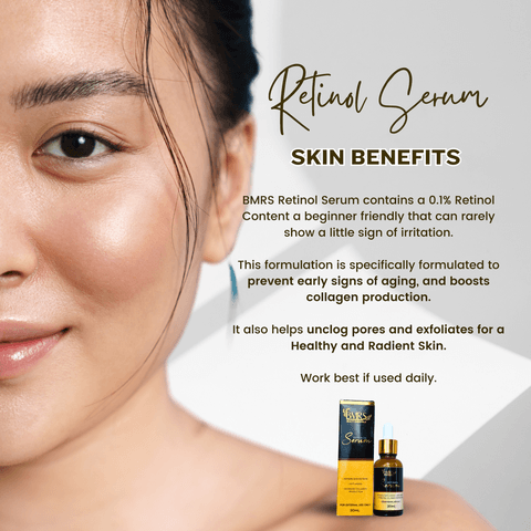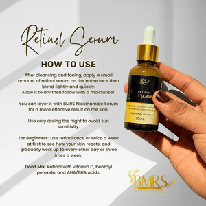 HOW TO USE1. After cleansing and toning, apply a small amount of retinol serum on the entire face then blend lightly and quickly.2. Allow it to dry then follow with a moisturiser.You can layer it with BMRS Niacinamide Serum for a more effective result on the skin.3. Use only during the night to avoid sun sensitivity.
