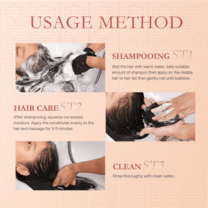 1.Wet the hair with warm water, take suitable amount of shampoo then apply on the middle hair to hair tail then gently rub until bubbles.
