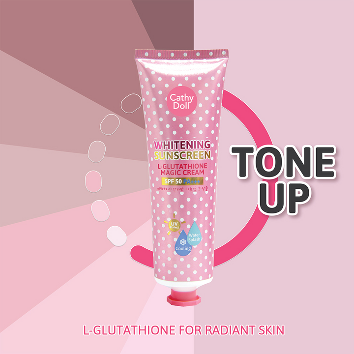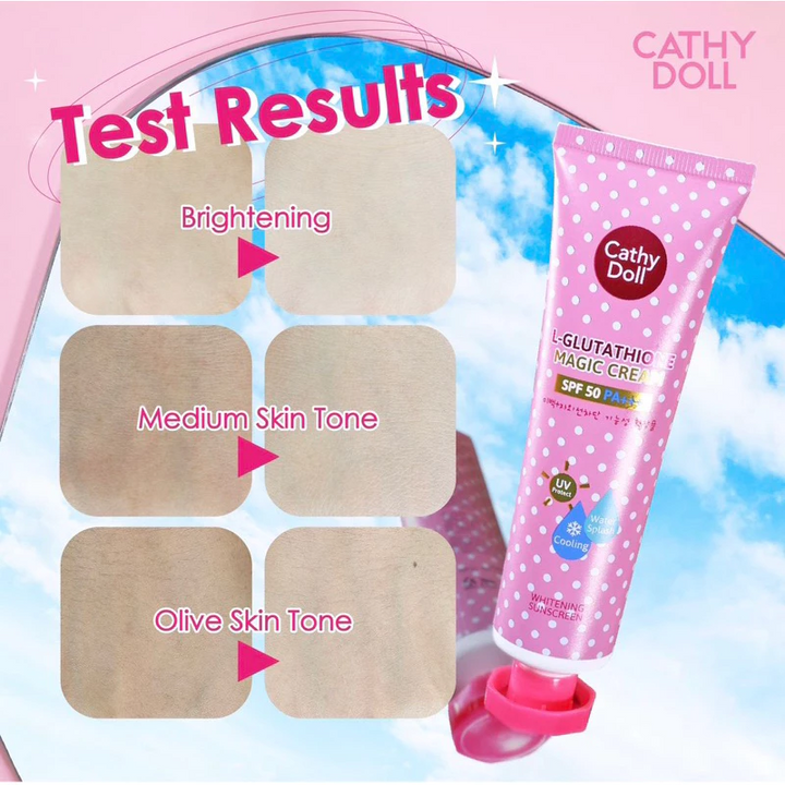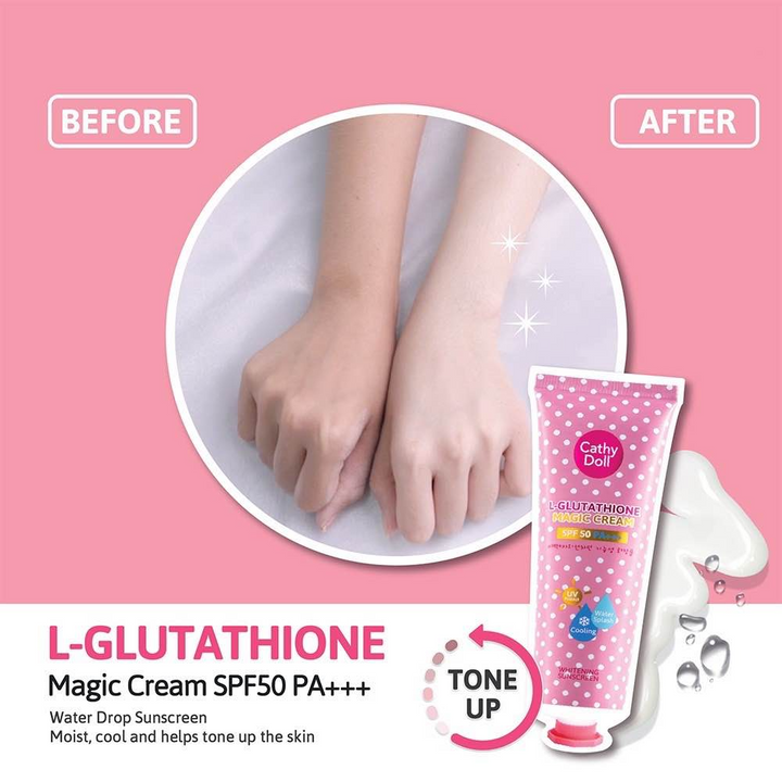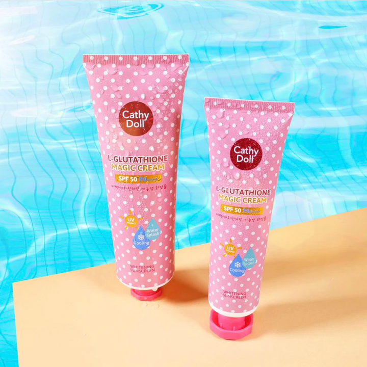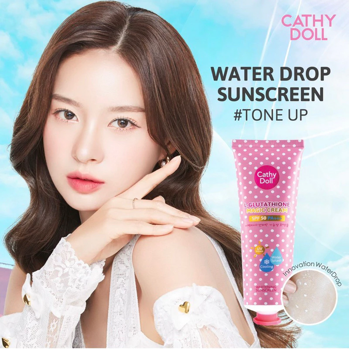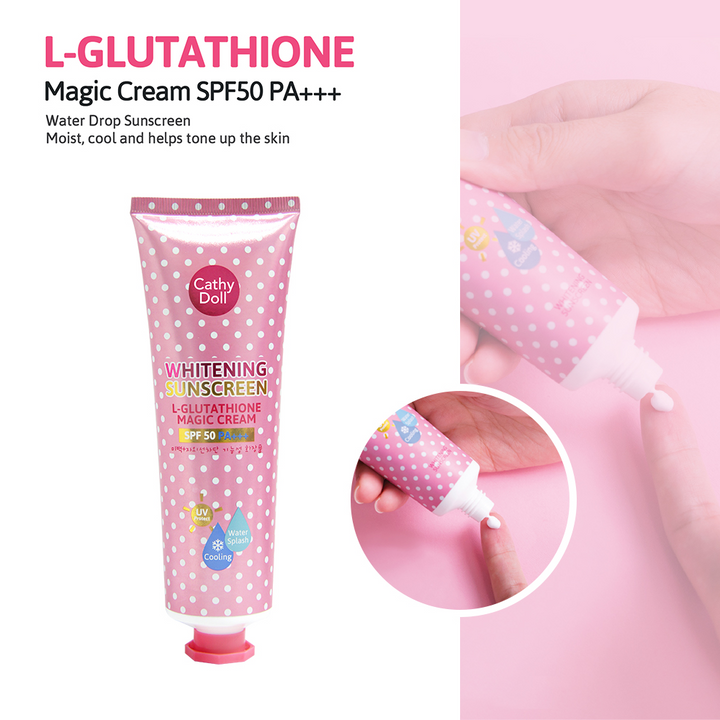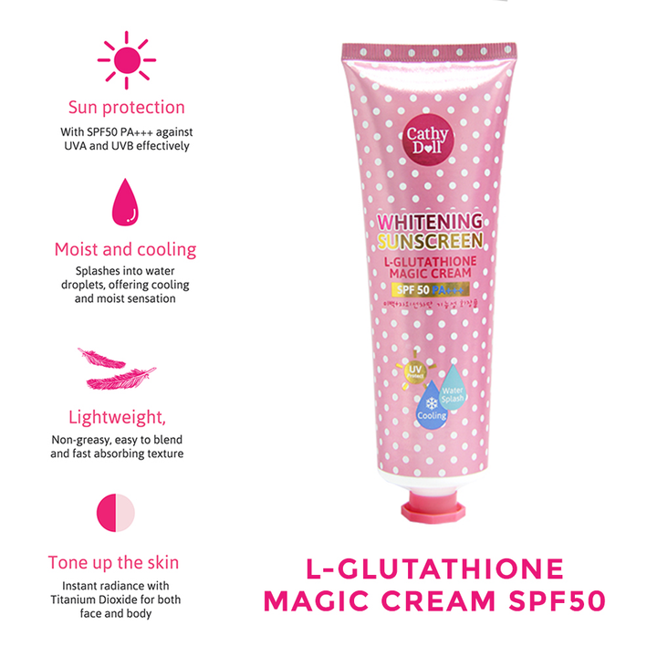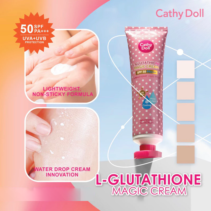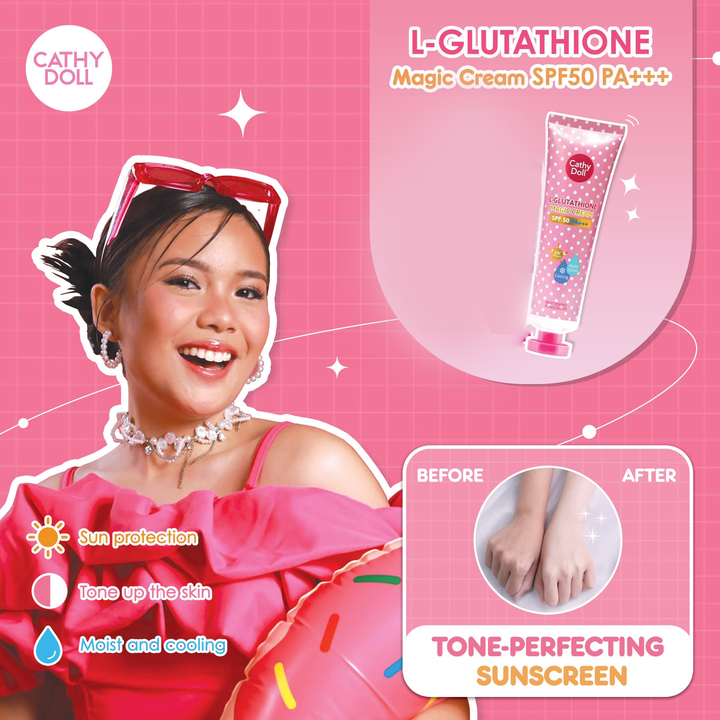 Reveal radiant, protected skin with Cathy Doll L-Glutathione Magic Cream, a top-rated sunscreen in Thailand, Korea, and Vietnam. This multifunctional Brightening sunscreen is more than just sun protection—it's a skin-brightening, moisturizing, and cooling solution designed for daily use on both the face and body.