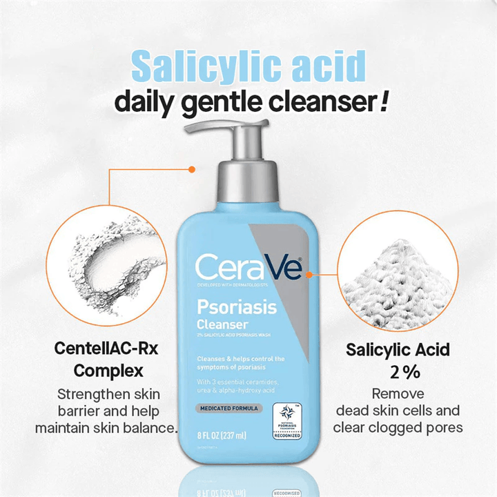 With 2% salicylic acid to help relieve irritated skin, lactic acid for mild exfoliation, three essential ceramides to promote skin-barrier function, moisturizing glycerin and urea, plus soothing niacinamide, CeraVe Psoriasis Cleanser gently cleanses psoriasis-prone skin, removes scales and helps the skin retain moisture.