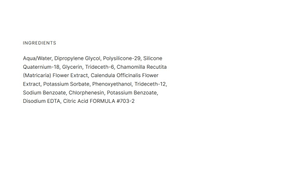 Aqua/Water, Dipropylene Glycol, Polysilicone-29, Silicone Quaternium-18, Glycerin, Trideceth-6, Chamomilla Recutita (Matricaria) Flower Extract, Calendula Officinalis Flower Extract, Potassium Sorbate, Phenoxyethanol, Trideceth-12, Sodium Benzoate, Chlorphenesin, Potassium Benzoate, Disodium EDTA, Citric Acid FORMULA #703-2