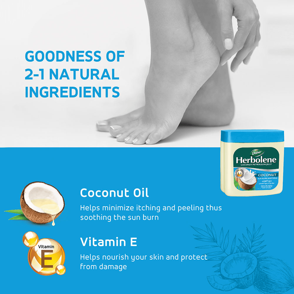 Dabur Herbolene is a herbal solution fortified with the benefits of Coconut Oil and Vitamin E to ensure softness of skin while keeping it nourished, healthy and beautiful. While Petroleum Jelly and Coconut Oil result in soft and soothed skin, Vitamin E nourishes and protects it from harsh weather conditions.