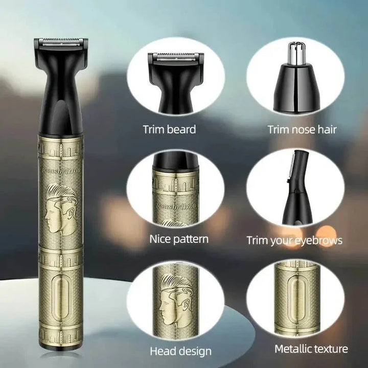 The Daling 4-in-1 Rechargeable Men’s Grooming Kit is a versatile tool crafted for a complete grooming experience. This multi-functional kit includes four interchangeable heads: a razor head for a close shave, a sideburns knife head for shaping, an eyebrow trimming knife head for precision detailing, and a nose trimmer head for efficient removal of unwanted nose and ear hair. Featuring an intelligent anti-hairpin system, it provides a smooth, comfortable grooming session with no pinching. The high-energy battery offers up to 120 minutes of use on a full charge, making it convenient for daily grooming routines. USB recharging allows for versatile power options, and the compact design makes it travel-friendly. With a sophisticated design and engraved handles