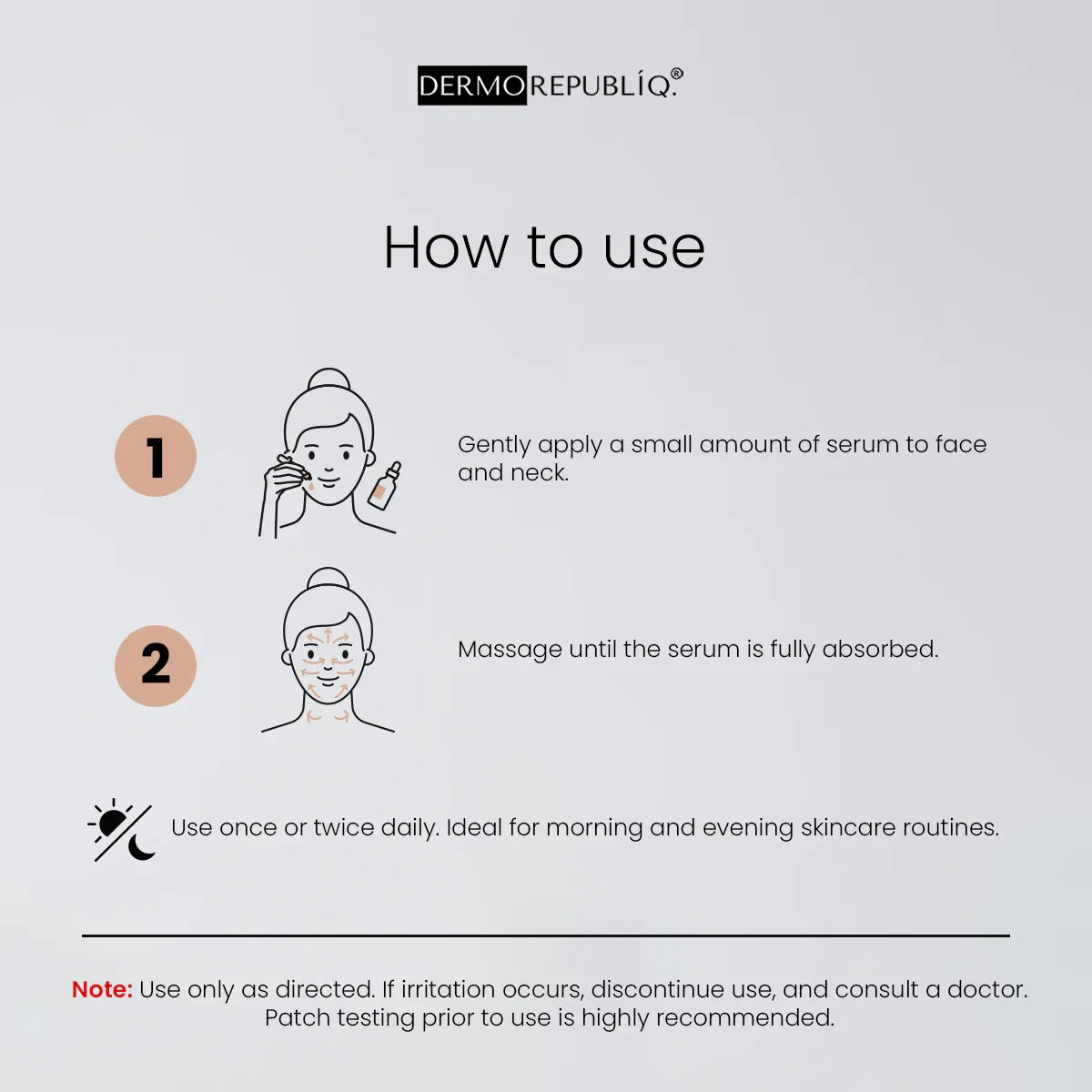 Apply a few drops to cleansed skin, morning and night. Gently massage until absorbed. Follow with moisturizer. Suitable for daily use.