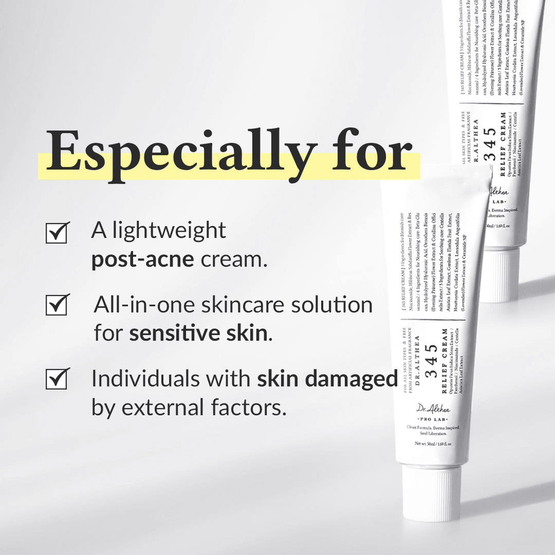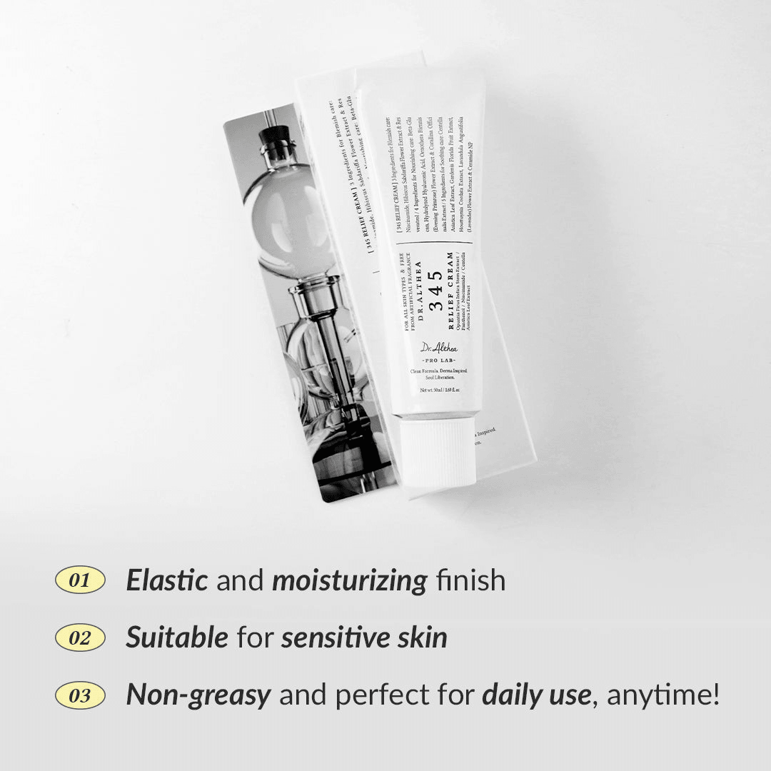 345 Relief Cream is a regenerating ointment gel cream rich in nutrients that skillfully combines ingredients to address blemishes, nourish the skin, and provide soothing care, resulting in a well-rounded skincare solution. This lightweight post-acne cream effectively tends to acne aftermath without a heavy feel. Its multi-layered cream structure offers a through and lasting skincare by catering to various skin needs, ensuring continuous hydration and nourishment.