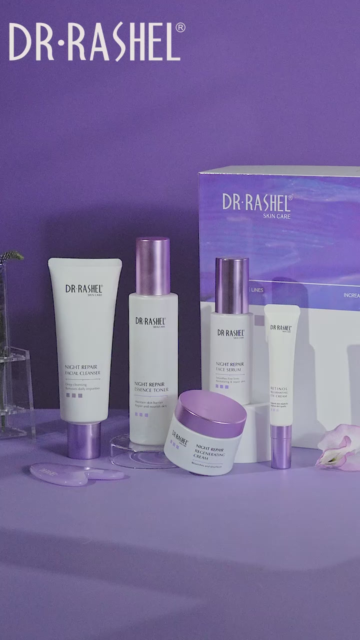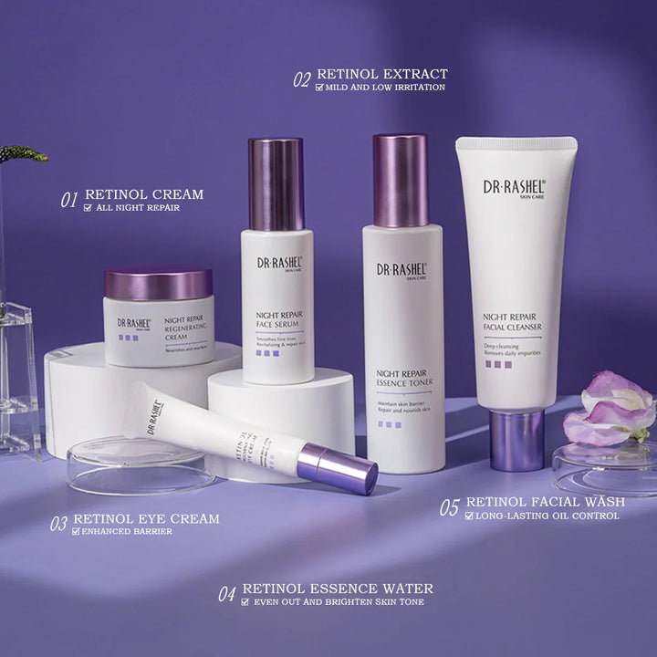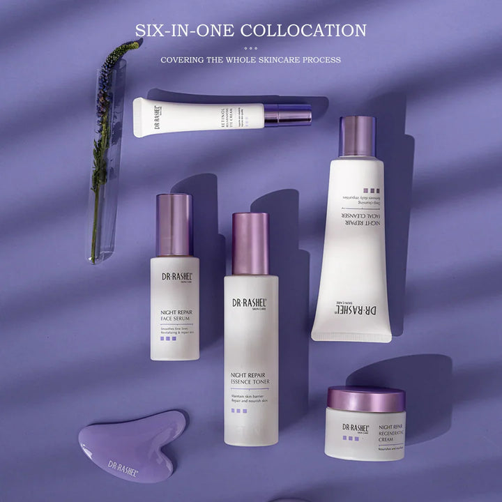 A comprehensive 6-piece night repair skincare set focused on anti-aging, hydration, and skin renewal.