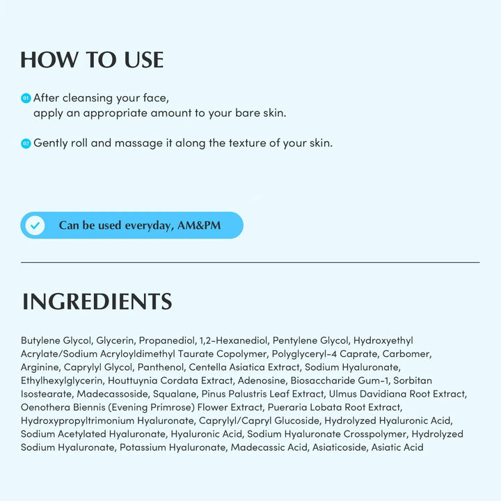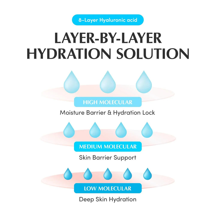 8-Layer Hyaluronic acid (High molecular weight - Protects moisture barrier / Medium molecular weight - Strengthens moisture barrier / Low molecular weight - Relieves dryness)