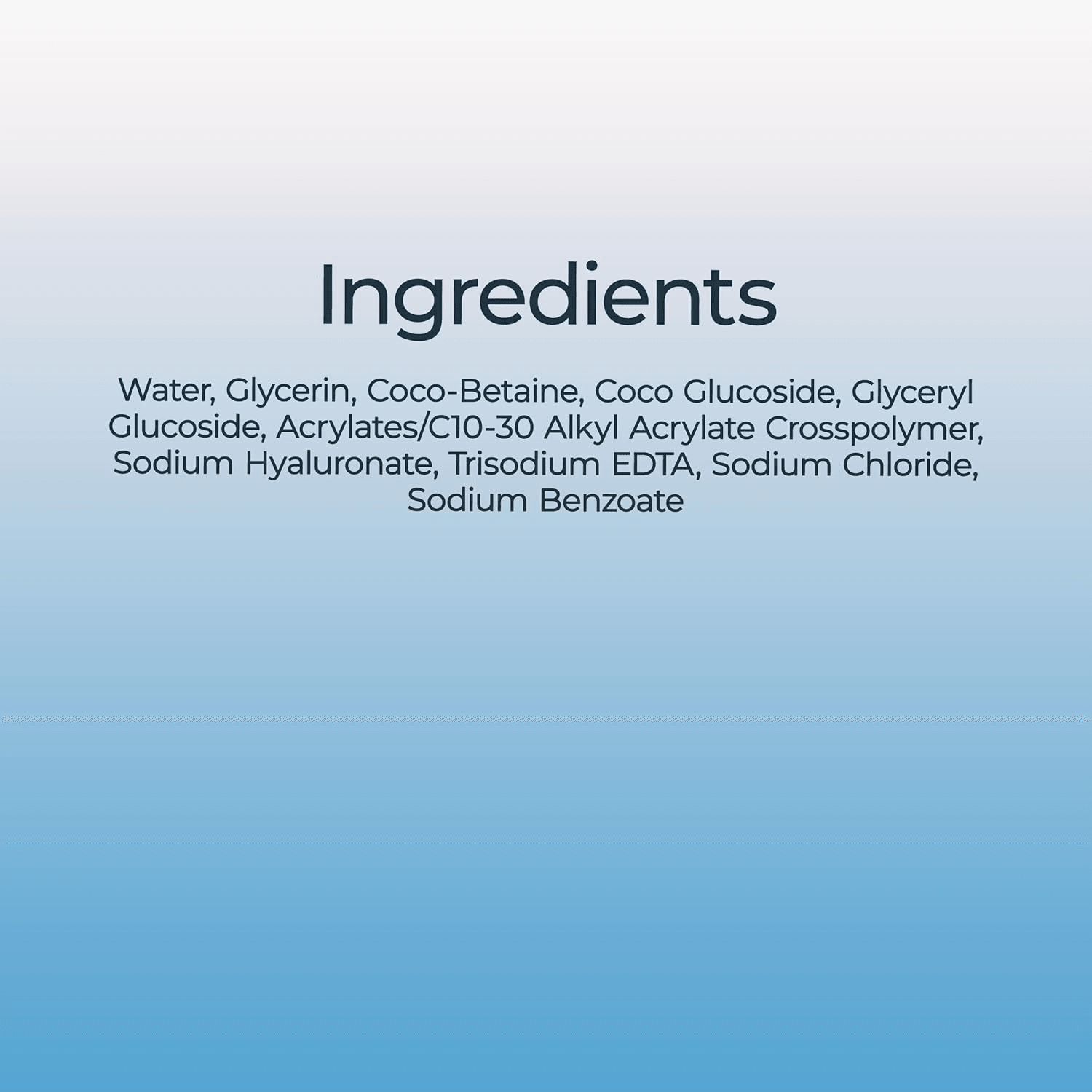 Water, glycerin, coco-betaine, coco glucoside, glyceryl glucoside, acrylates/ c10-30 alkyl acrylate crosspolymer, sodium hyaluronate, trisodium edta, sodium chloride, sodium benzoate.