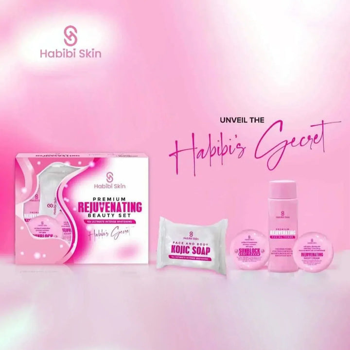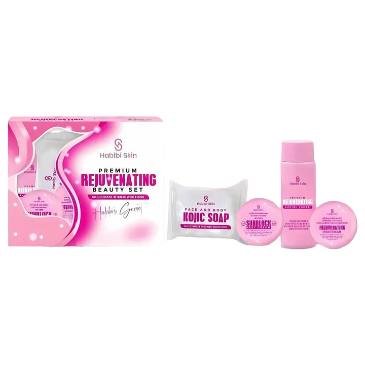 Uncover the secret to clearer, smoother, and more radiant skin with the Habibi Skin Premium Rejuvenating Beauty Set. Specially formulated to target common skin concerns such as melasma, pimples, blackheads, whiteheads, and signs of aging, this advanced skincare set offers a complete rejuvenation experience with its 10x Ultimate Intense Whitening formula.