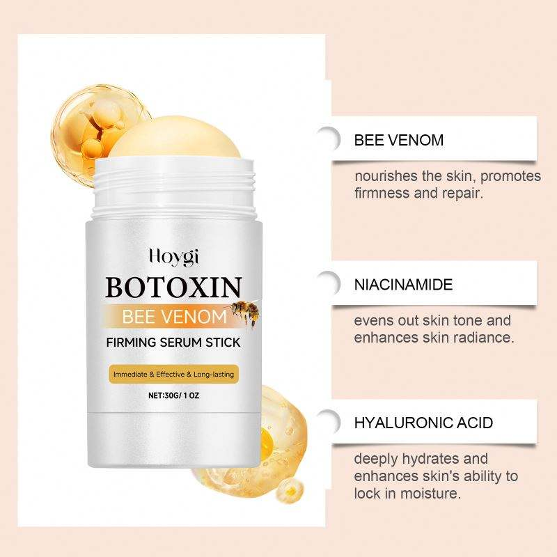 Lift, smooth, and firm with Hoygi Botox Bee Venom Firming Serum Stick — a convenient anti-aging serum stick designed to help improve the appearance of fine lines, wrinkles, sagging skin, and loss of elasticity on both the face and body.