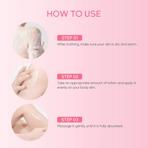 After bathing, take a proper amount of lotion and apply it evenly on your body skin and then gently massage until it's fully absorbed.