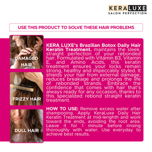 Maintain the sleek, straight perfection of your rebonded hair with Keraluxe Brazilian Botox Daily Hair Keratin Treatment—specially formulated to protect, strengthen, and extend the life of rebonded and straightened hair.