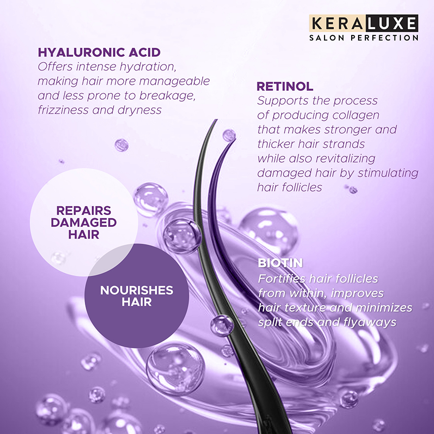 Infused with a powerful trio of Hyaluronic Acid, Biotin, and Retinol, this keratin treatment deeply hydrates, strengthens, and smoothens hair while enhancing manageability and shine. With regular use, it helps reduce frizz, repair visible damage, and bring back your hair’s natural beauty—leaving it healthier, softer, and more resilient.