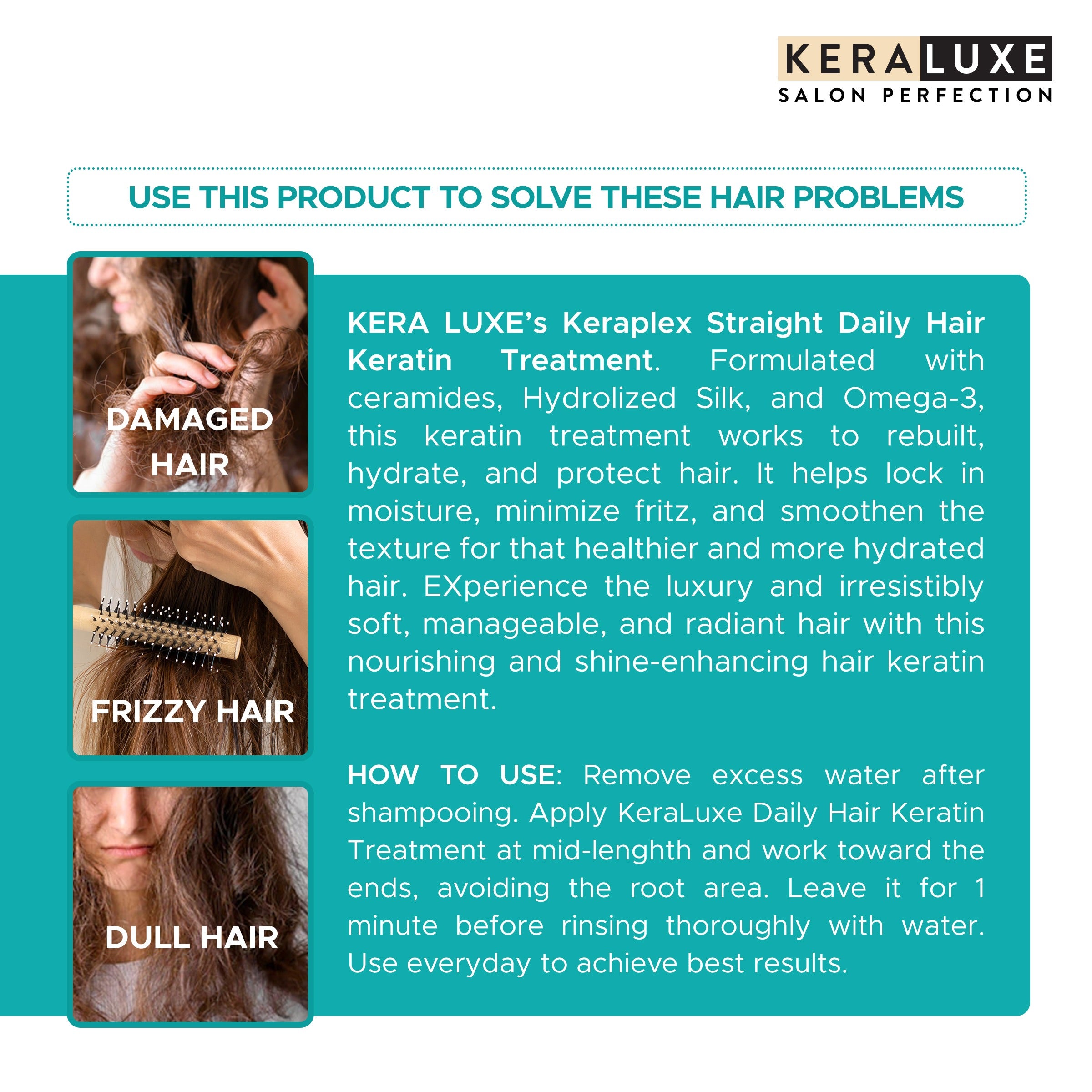Experience the luxury of irresistibly smooth, hydrated, and luminous hair with Keraluxe Keraplex Straight Daily Hair Keratin Treatment.