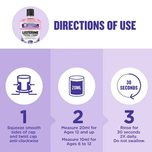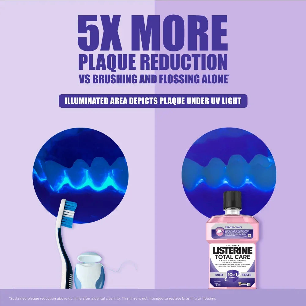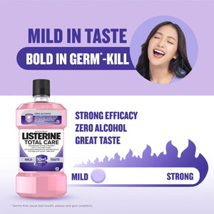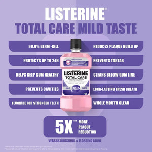 Used twice daily after brushing, LISTERINE Total Care Mild Taste provides complete oral protection with 10-in-1 benefits. Its advanced formula kills 99.9% of germs* that cause bad breath, plaque, and gum problems leaving your whole mouth fresh and clean.