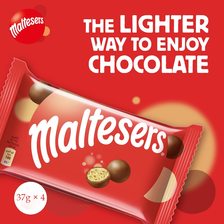 Each Maltesers chocolate has a light, crispy malt center wrapped in smooth milk chocolate, offering a unique combination of textures and flavors.