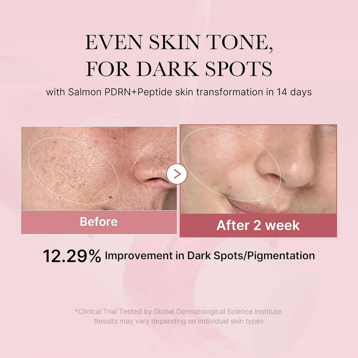 Salmon PDRN: Salmon PDRN supports skin vitality and helps improve overall skin condition, giving your skin a clearer, more radiant appearance. It promotes a more even skin tone and a natural glow by enhancing skin health.