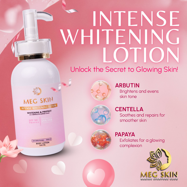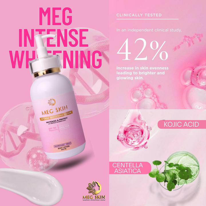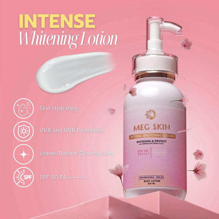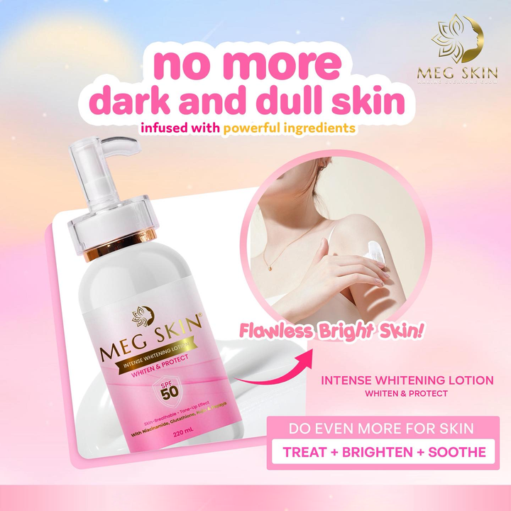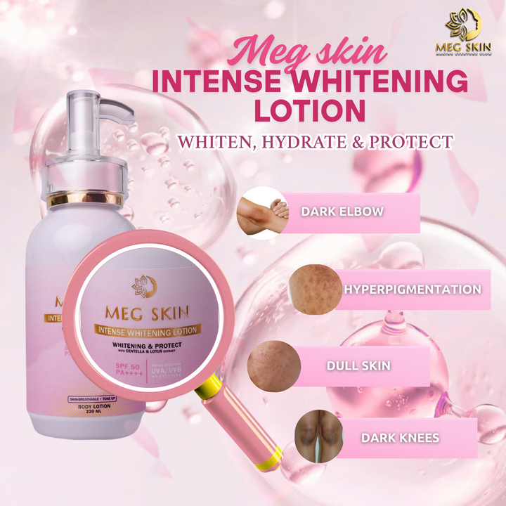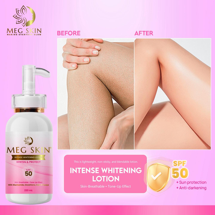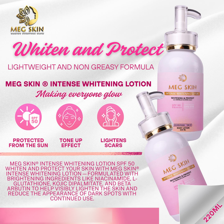 - Achieve visibly brighter, smoother, and more even-toned skin with MEG SKIN Intense Brightening Lotion SPF 50. Specially formulated to deliver instant whitening while nourishing and protecting your skin, this lotion combines powerful brightening agents with sun protection and skin-loving botanical extracts.