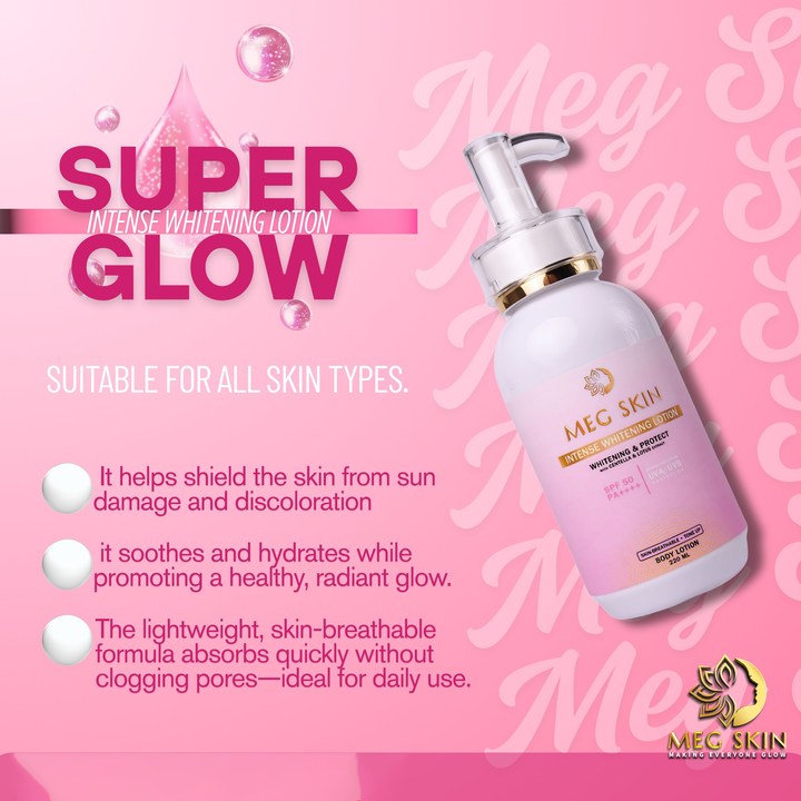 Enjoy a luminous, healthy glow with MEG SKIN Intense Brightening Lotion SPF 50 your all-in-one solution for skin brightening, hydration, and sun protection.