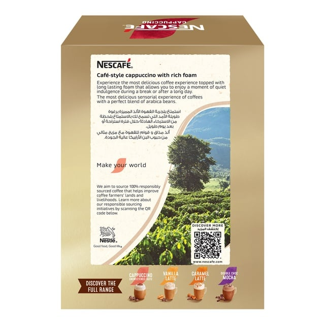 Discover the perfect cafe experience at home with NESCAFE Cafe-Style Cappuccino sachets. Each serving delivers a delicious, high-quality coffee topped with a rich, creamy foam for an indulgent treat anytime.